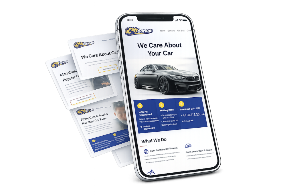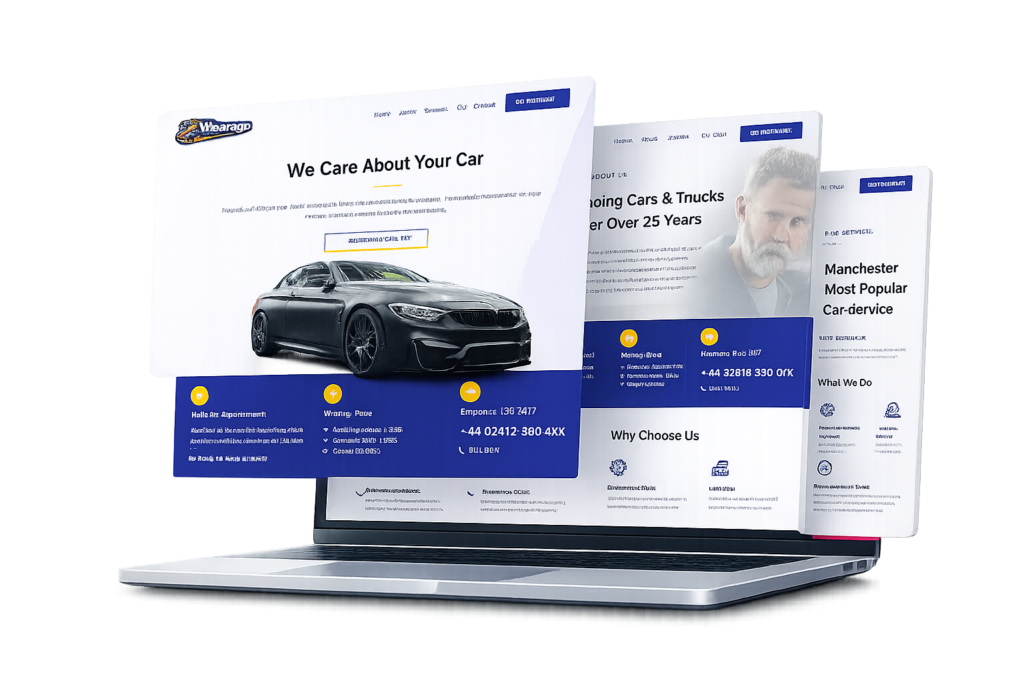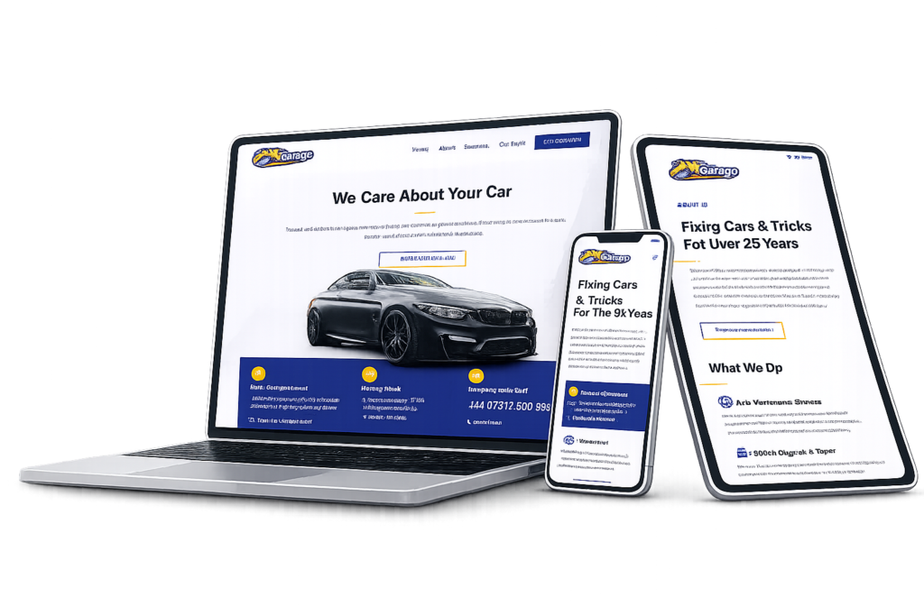 A modern and highly appealing website designed for a medium-sized car garage, highlighting key services and important information directly from the homepage. The site provides a clear and professional layout that helps visitors quickly understand the business and its services.